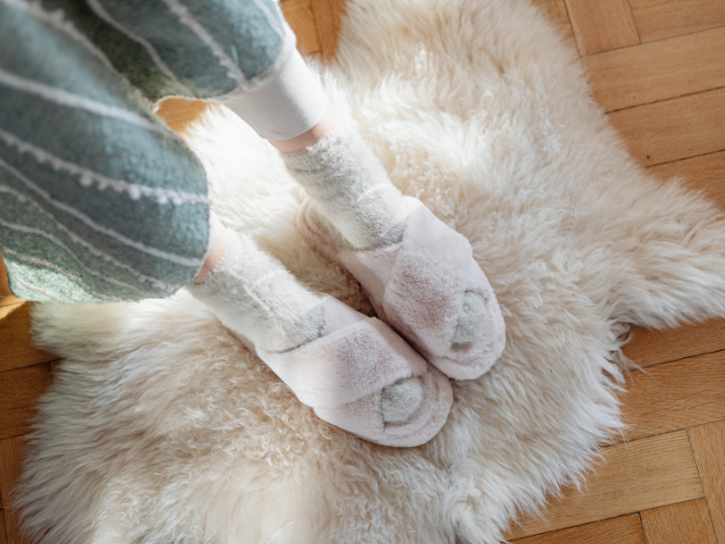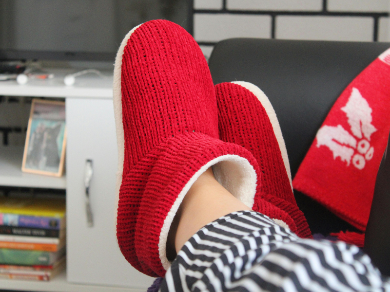 秋冬は、保温性の高い素材が必須です。ボア素材、フリース、ニット、ファーなど、温かみのある質感のルームシューズが活躍します。足首まで覆うタイプなら、冷気をシャットアウト。