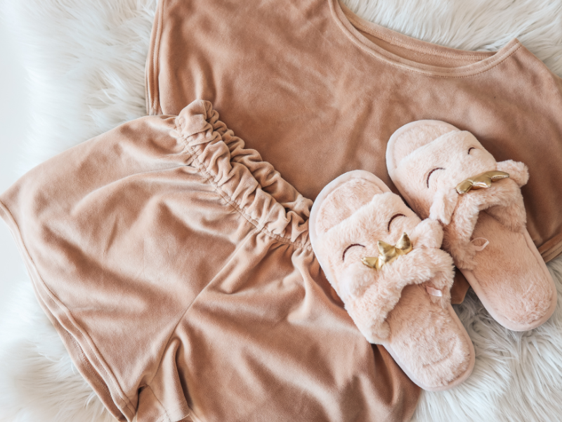 ルームウェアとルームシューズの素材感を合わせることで、こなれた印象になります。リネンのルームウェアには天然素材のスリッパ、ベロアのパジャマにはファー素材のルームシューズといった具合に。